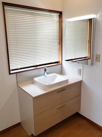 | 換気扇は換気・暖房・乾燥・涼風の1台4役の機能がついた"三乾王"。どんな季節でも快適な入浴時間が過ごせます。 | 2階の洗面台はアイテムの組み合わせが豊富なTOTOのドレーナ。正面には窓があったので、収納付の鏡は右手の壁に設置しました。 |