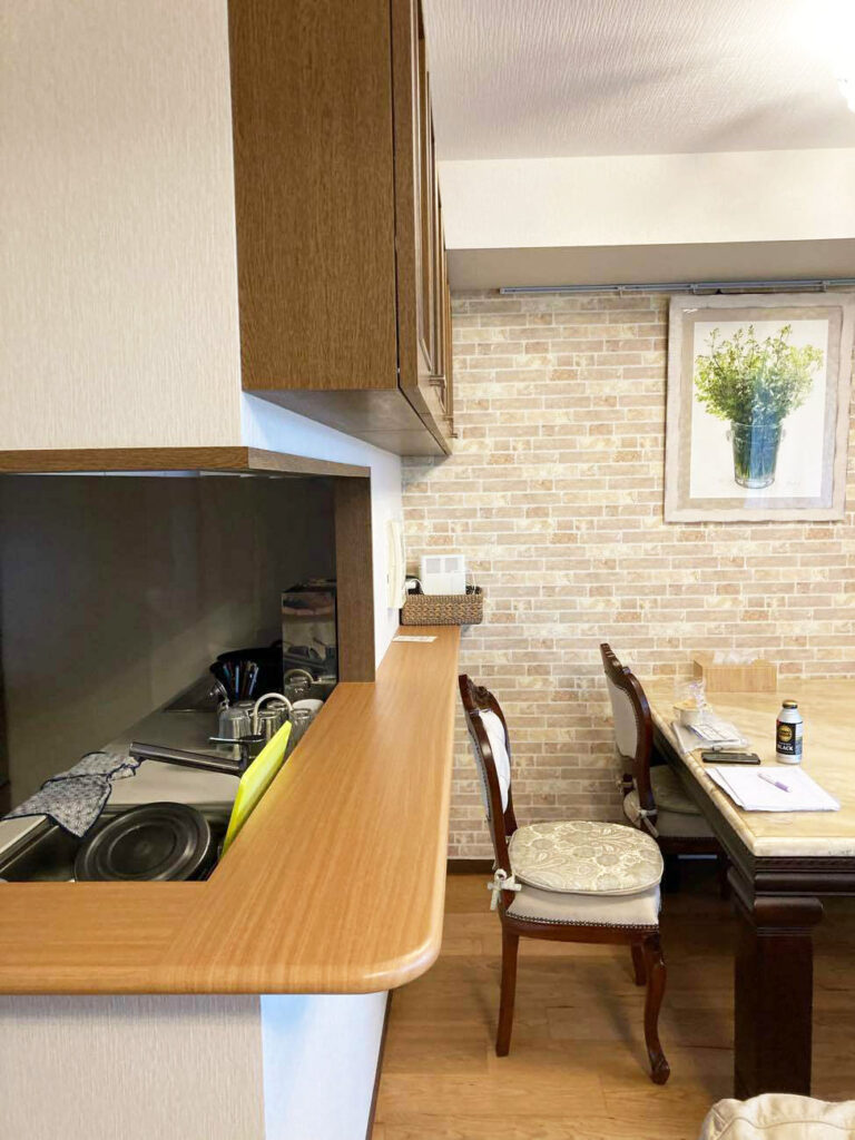 LDKはクロスの柄や床の色が、元々お持ちだった石目調のテーブルと合う雰囲気に仕上がりました。