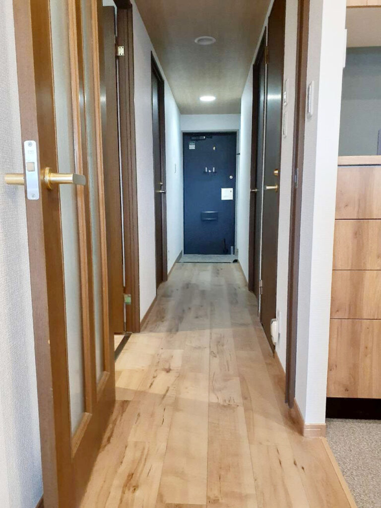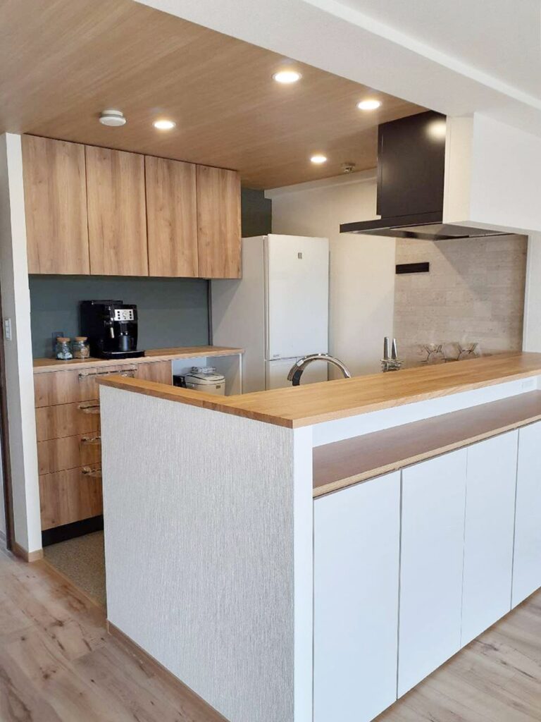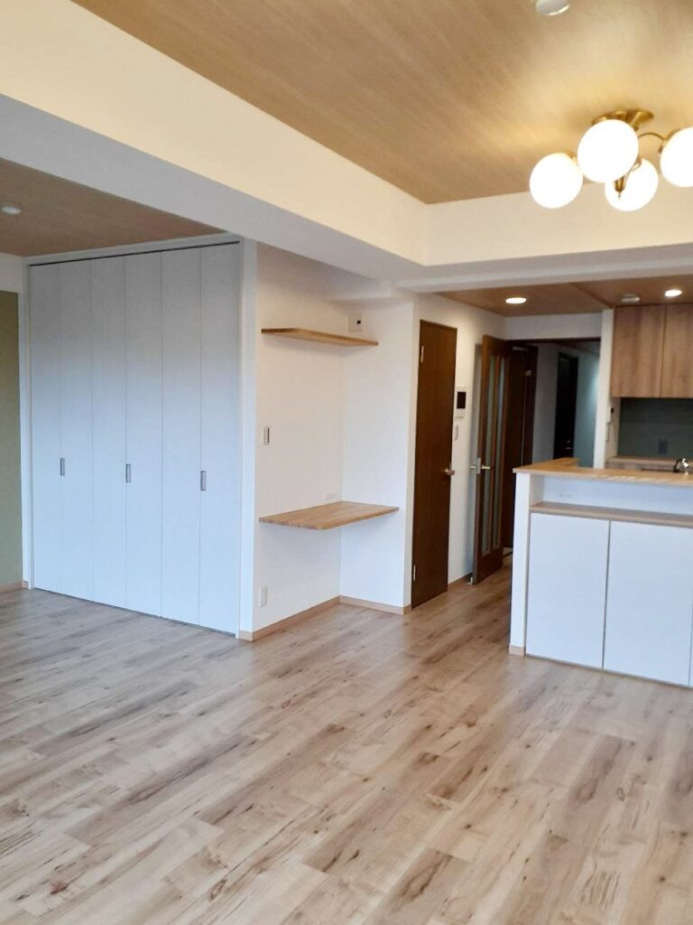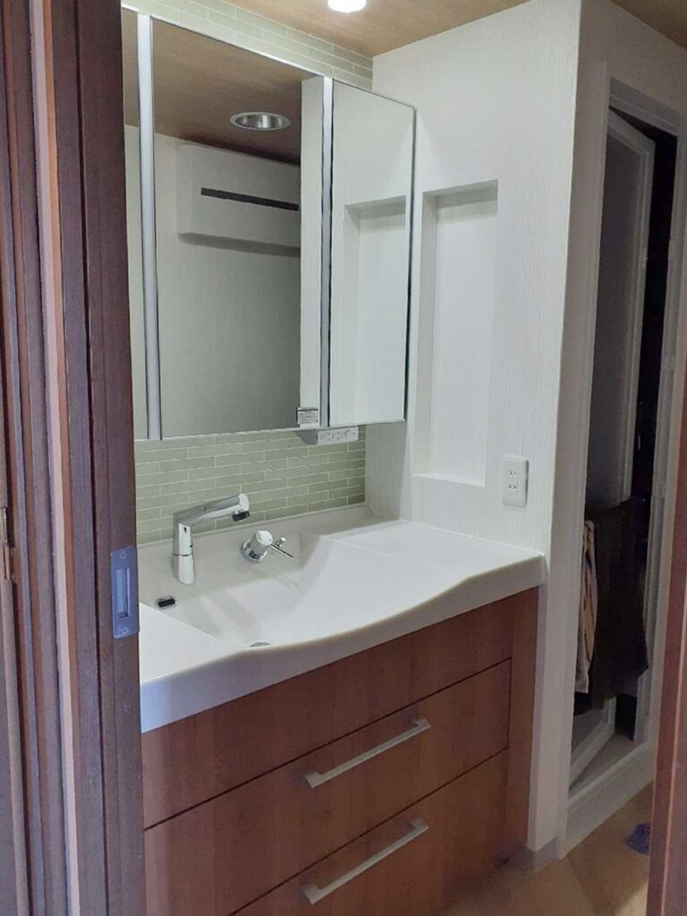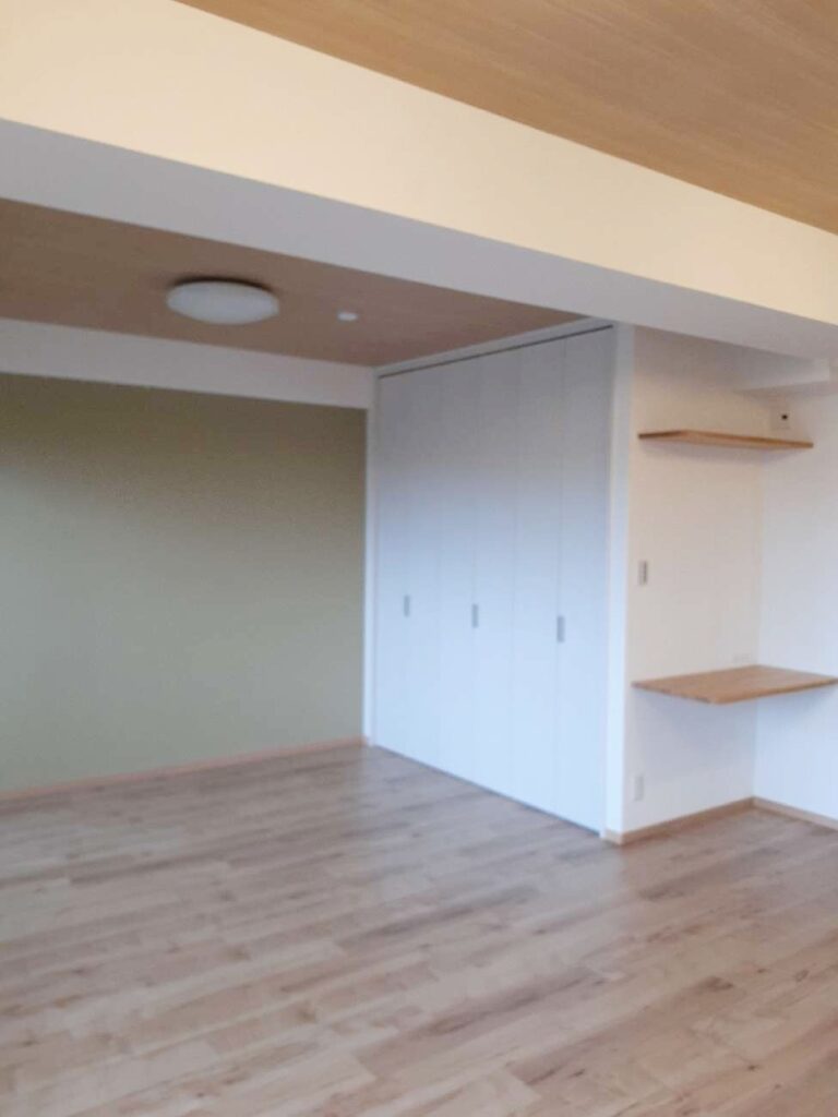 【キッチン】 キッチン・カップボード取替 袖壁撤去、カウンター取替、カウンター下収納取替 壁・天井クロス貼替、クッションフロア貼替 巾木取付、照明取替 【リビング】 壁・天井クロス貼替、床フローリング上貼、巾木取付 ピクチャーレール取付、カーテンレール取替 【和室】 洋室にリフォームし、リビングと繋げる 【洗面所】 洗面台取替、埋込収納撤去 壁・天井クロス貼替、床クッションフロア貼替 ソフト巾木取替、洗濯パン・洗濯水栓・分電盤取替 洗濯機上可動棚取付 【トイレ】 トイレ取替、壁・天井クロス貼替 床クッションフロア貼替、換気扇取替 【洋室1】 カーペット→フローリングに張替、壁・天井クロス貼替 巾木・カーテンレール取替 【洋室2】 壁・天井クロス貼替、カーペット→フローリングに張替 カーテンレール・巾木取替 【廊下】 壁・天井クロス貼替、床フローリング上張 土間フロアタイル貼り 【その他】 給湯器取替、給水・給湯・追い炊き配管取替 |